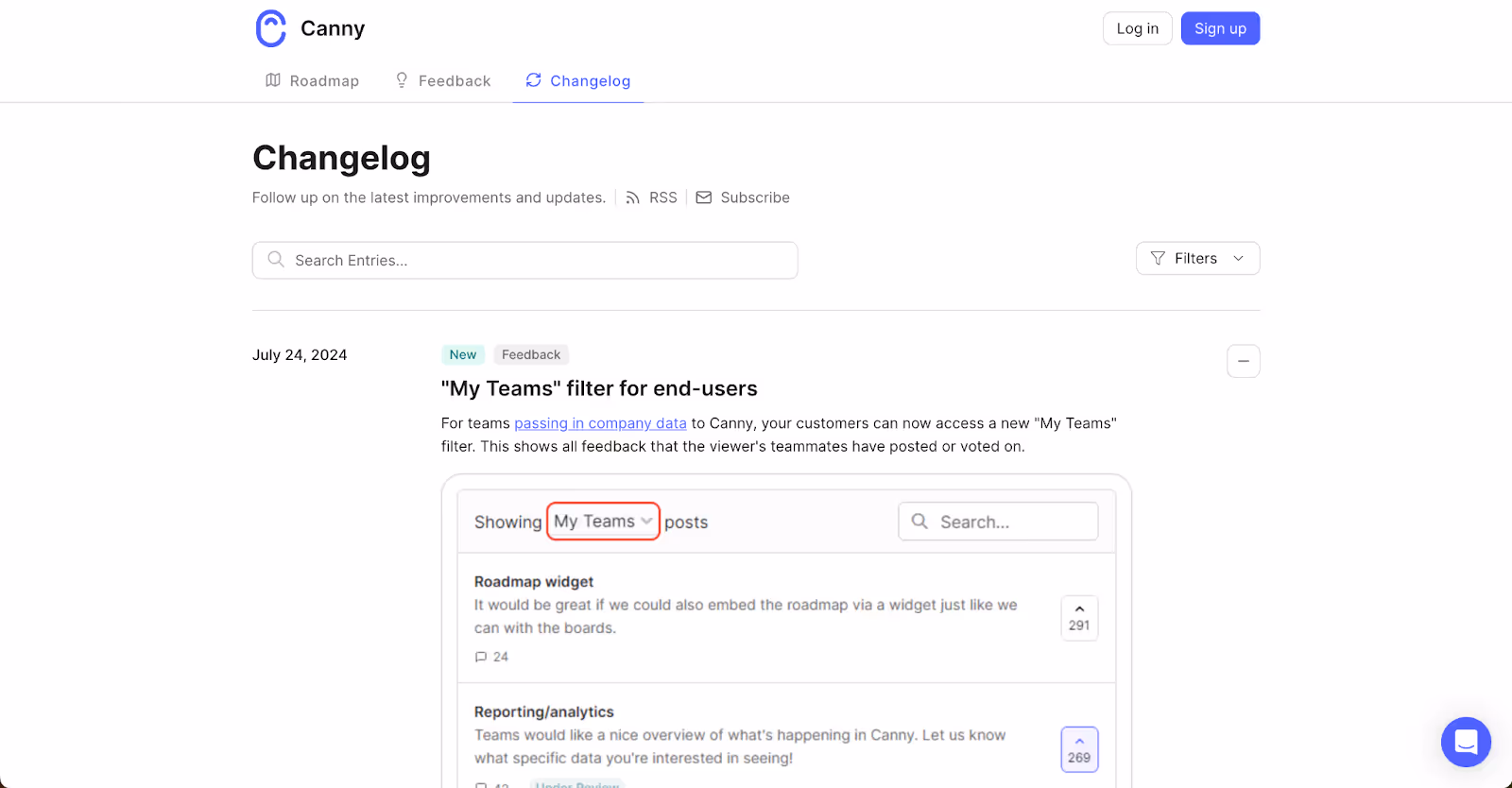 Canny offers a changelog feature to keep all your updates in one place and document them.