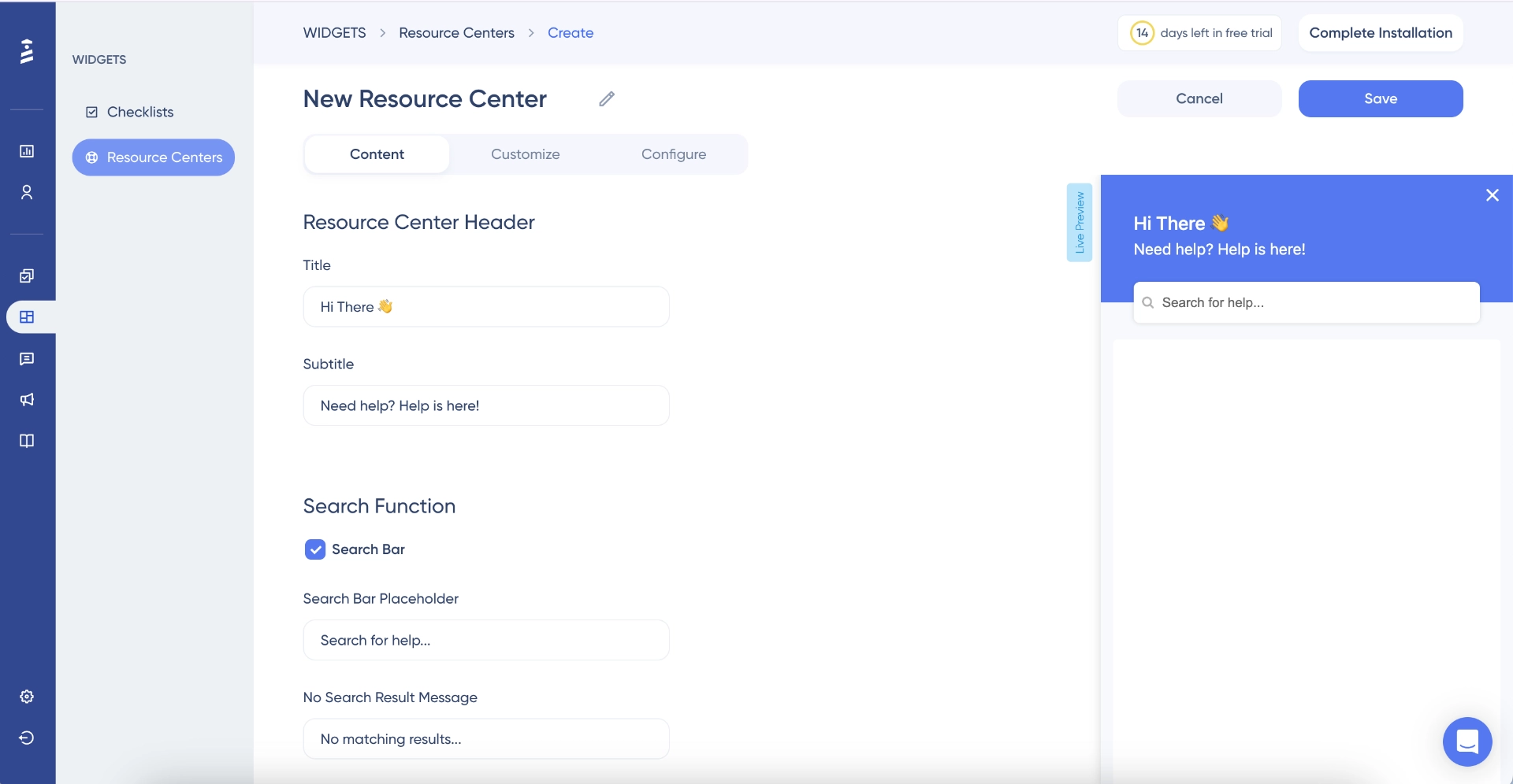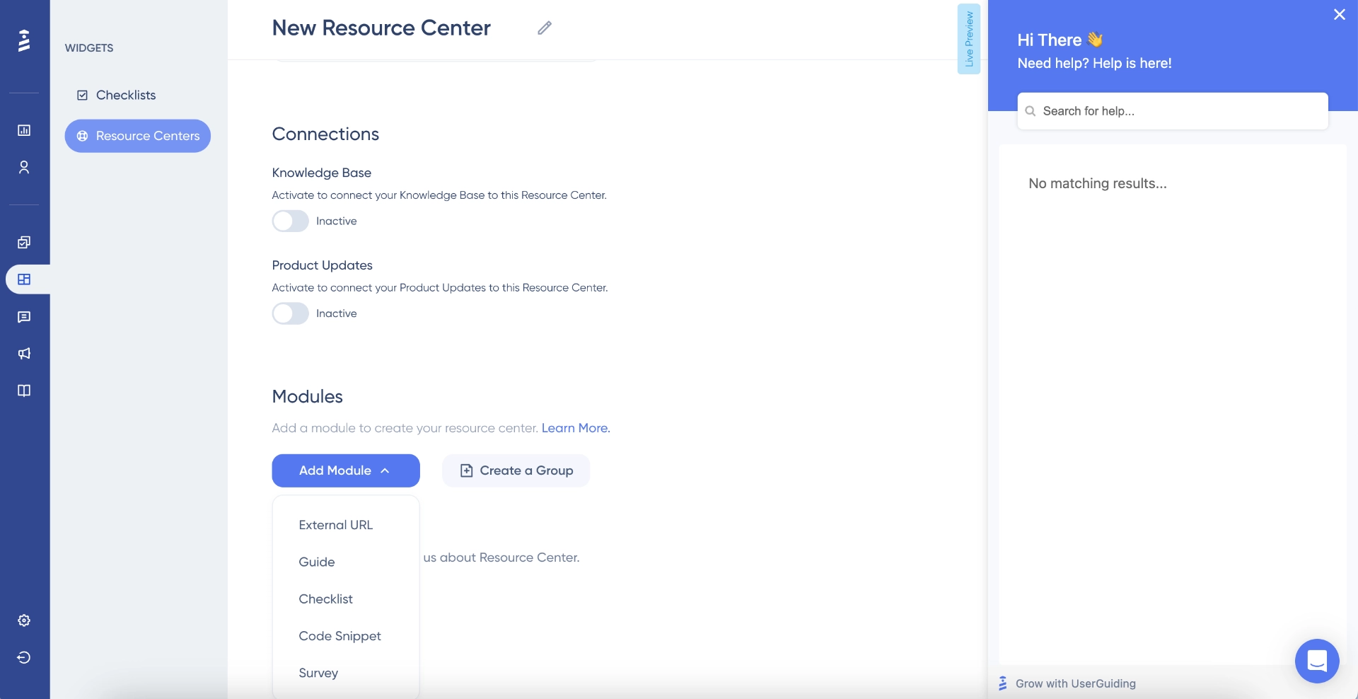 Or, with UserGuiding, you can set up in-app resource centers that gather all your helpful articles and links in one place.