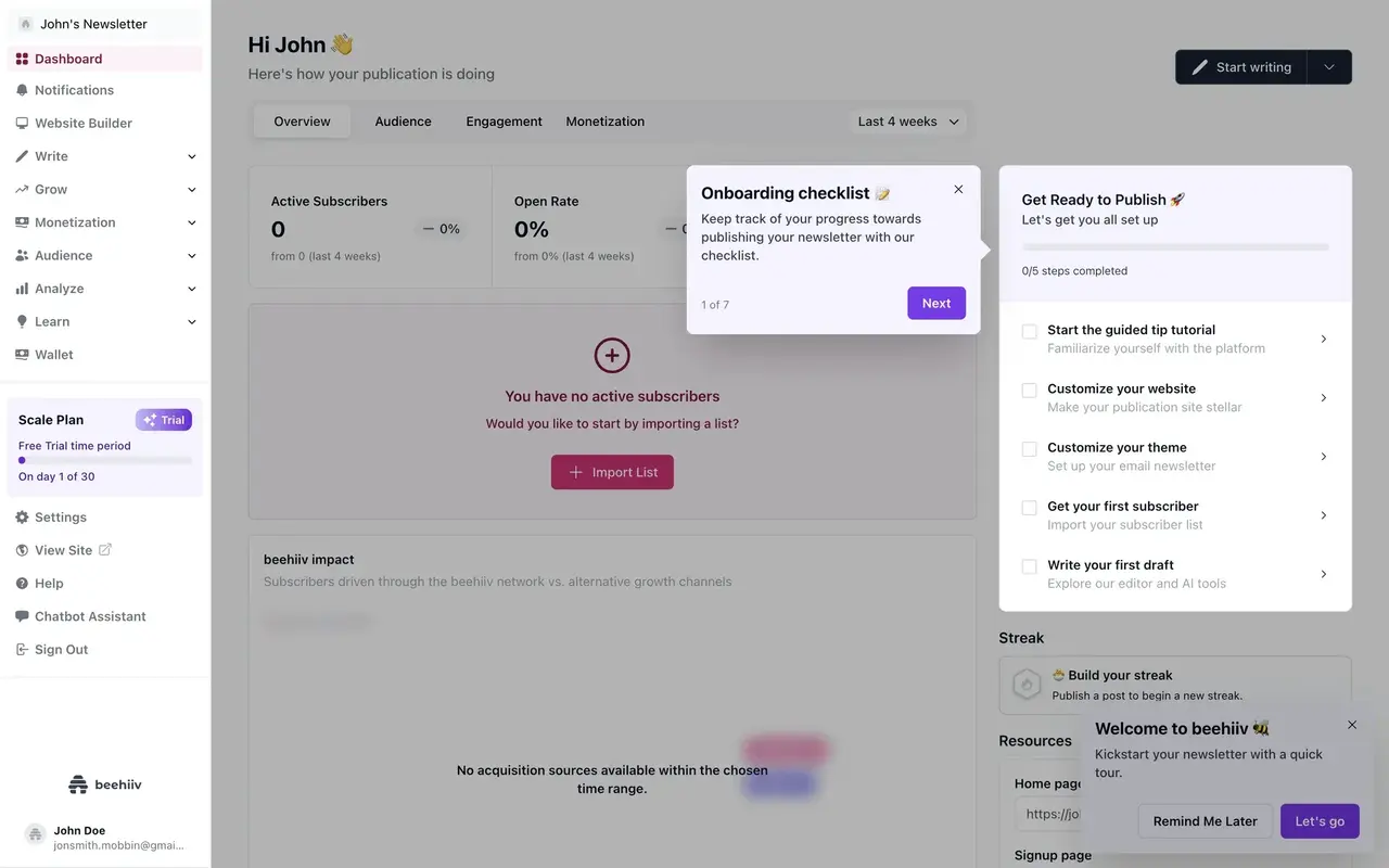 When the product tour ends, users will meet an onboarding checklist that lists the next steps they should take to finish the onboarding.