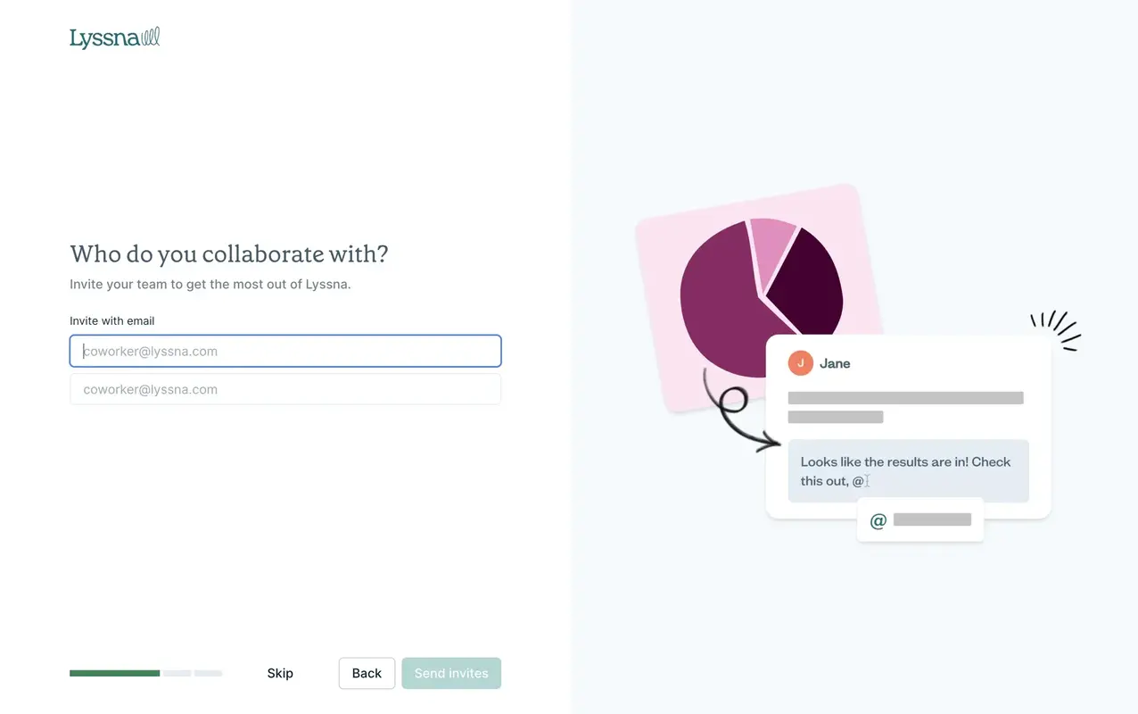The next step involves the user filling in the email addresses of the colleagues or friends with whom the user wishes to collaborate; Lyssna customizes the image on the right based on the addresses the user provides.