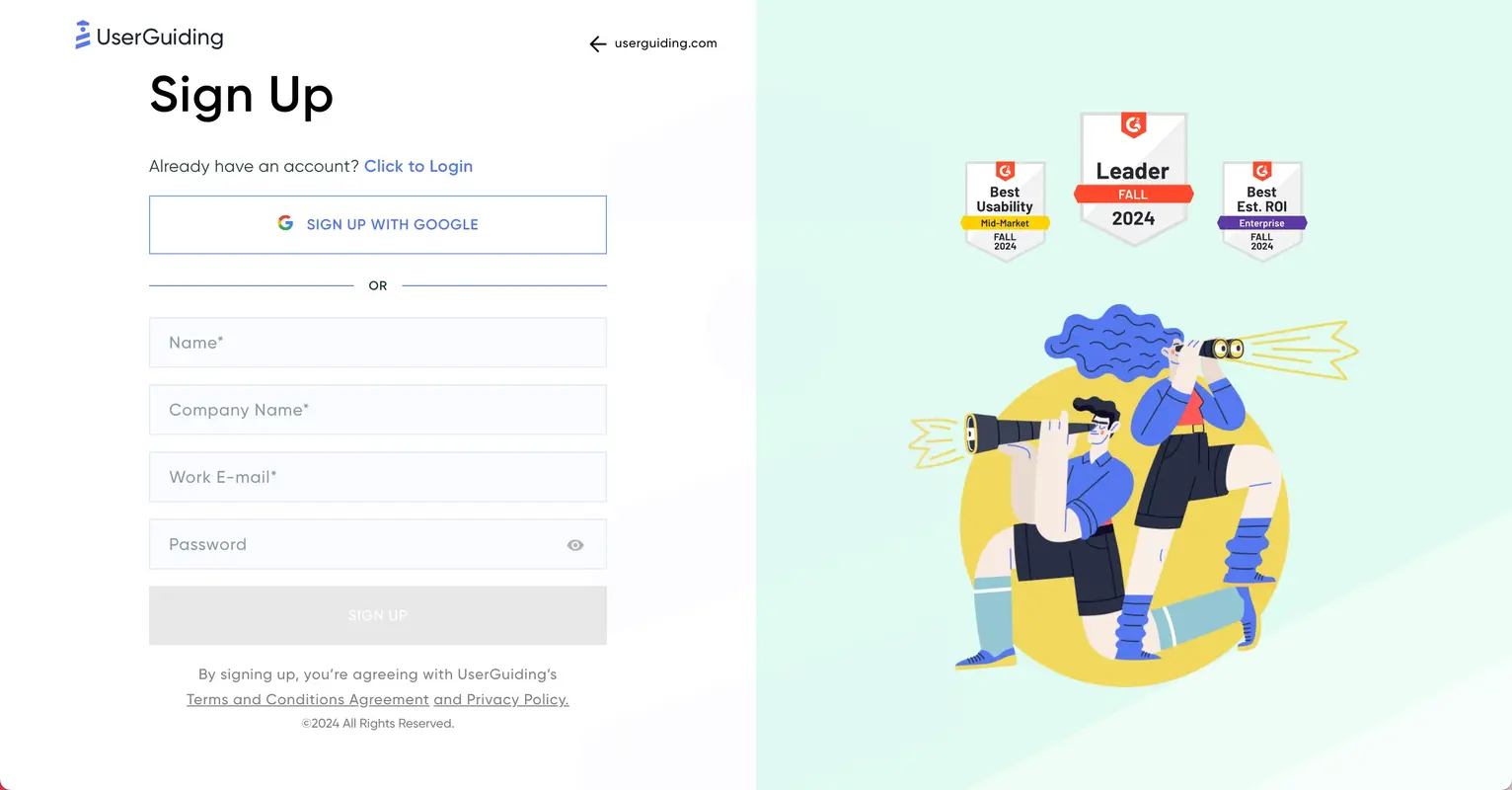 UserGuiding streamlines the sign-up process, with minimum blanks to fill in and the ability to use the single sign-on tool.