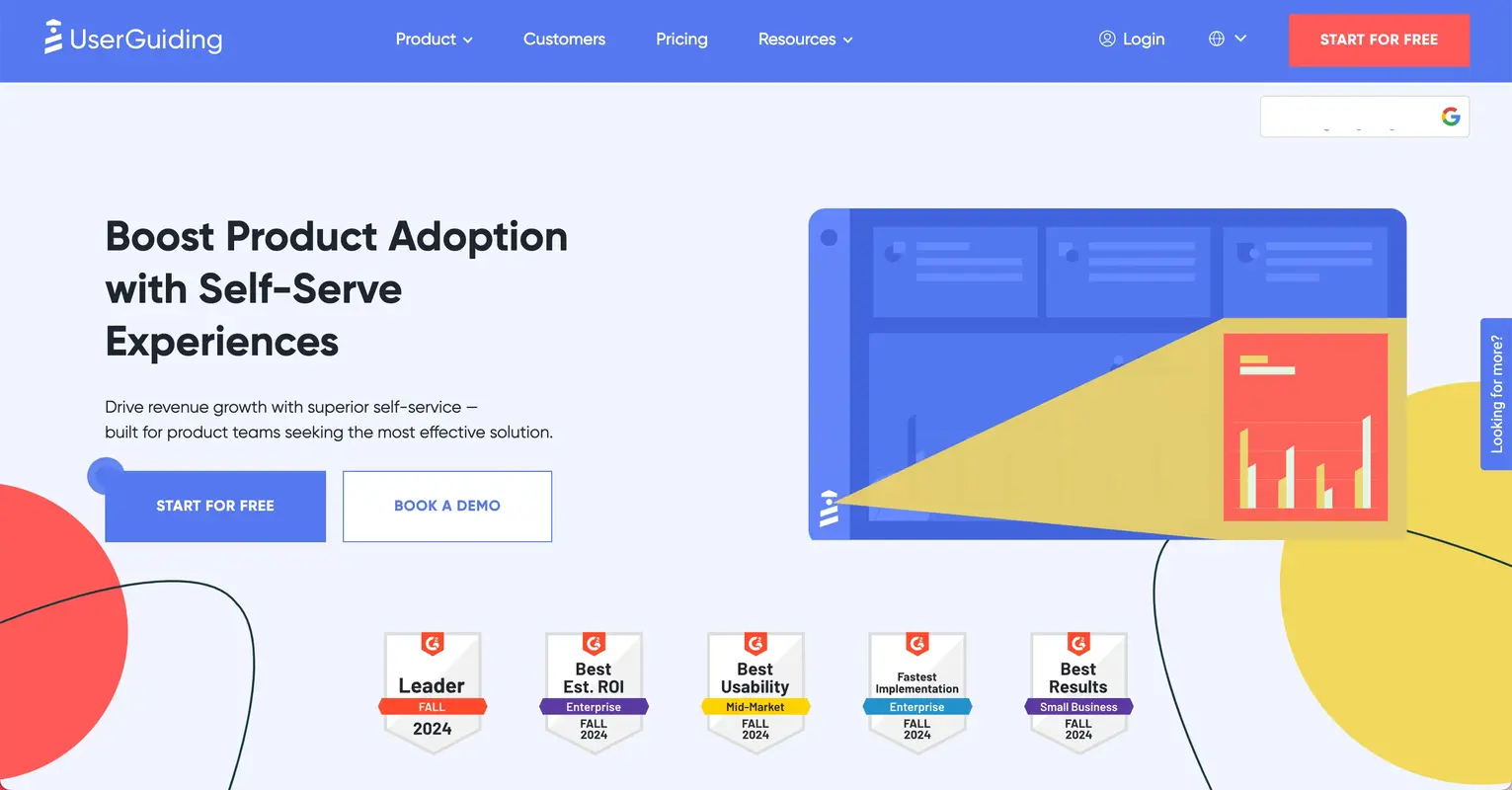 UserGuiding’s main page displays a strong value proposition in a clear and concise manner and involves a call-to-action button.