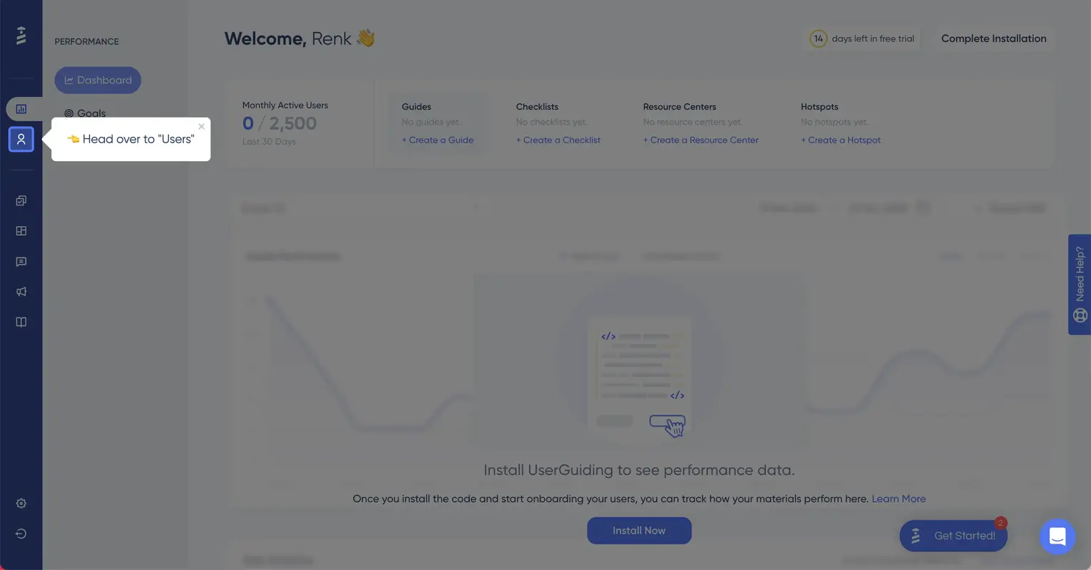 After finishing the sign-up process, UserGuiding provides new users with a screen to customize the interface that will display content.