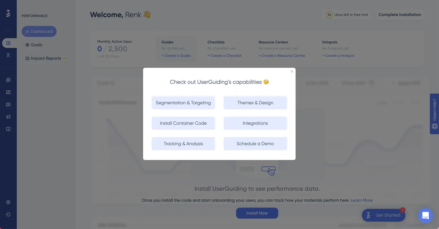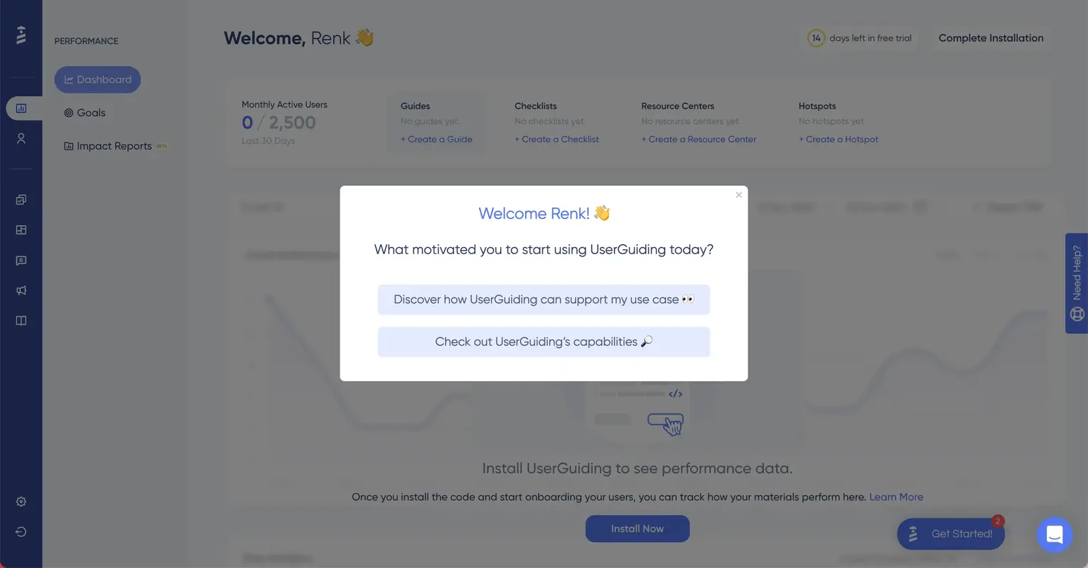 This screen appears if users choose to check UserGuiding’s capabilities during the onboarding process.