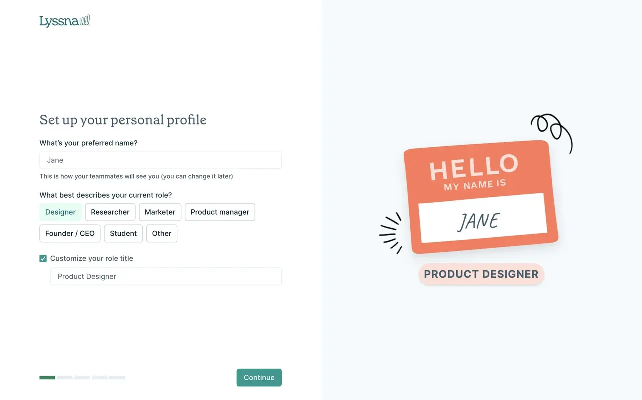 Right after the registration process, Lyssna asks for more information regarding the user (such as roles) to understand and assign a relevant user persona.