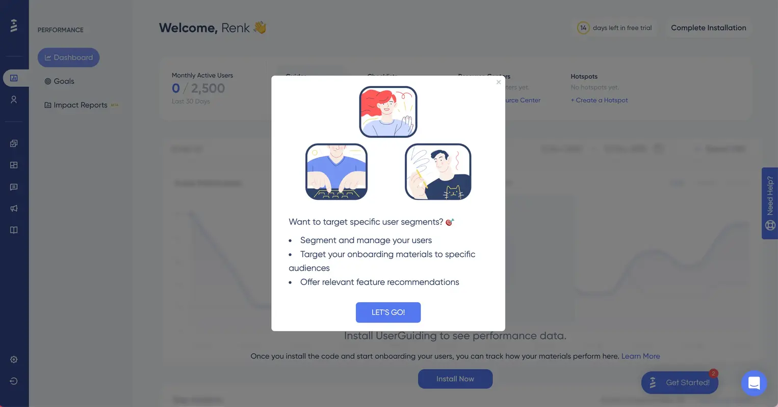 This modal uses engaging visuals to captivate users and explains what users can achieve by making use of segmentation through UserGuiding in short and simple bullet points.