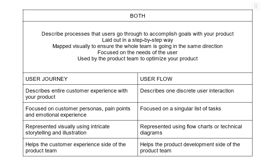 Consider also that a user flow is more of a tool to facilitate technical discussion. Unlike a user journey, it doesn't address the emotional part of a customer's product experience.