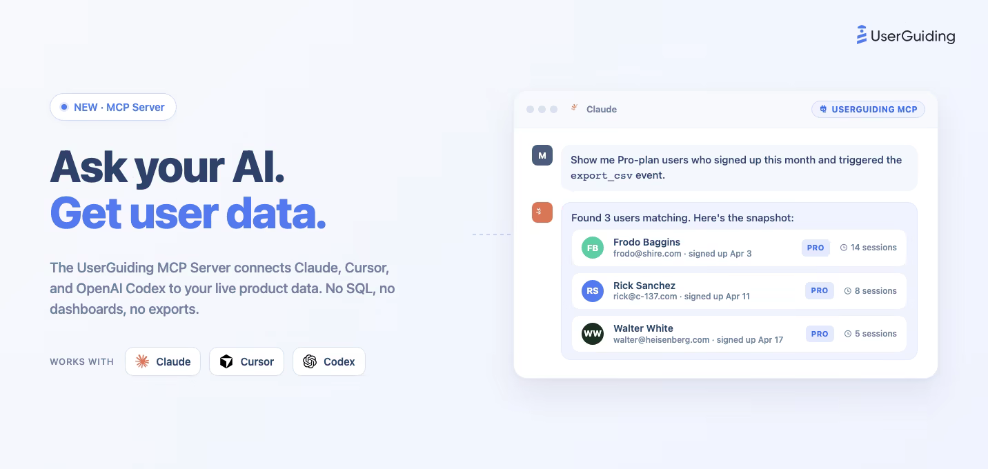 Demandez à Claude de vous montrer chaque utilisateur de votre plan Pro qui s'est inscrit le mois dernier mais n'a pas encore déclenché votre événement d'activation principal, et vous obtenez la réponse en quelques secondes. Pas de SQL, pas de filtres de dashboard, pas d'exports CSV. C'est le UserGuiding MCP Server : une ligne directe entre votre outil d'IA et les données produit en temps réel que vous suivez déjà dans UserGuiding.